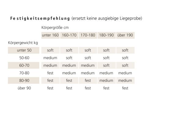 Für die passende Matratze ist auch die richtige Festigkeit ausschlaggebend. Wählen Sie diese nach Ihrer Körpergröße, Ihrem Gewicht und Ihren Schlafgewohnheiten – so stellen Sie sicher, dass sich die Matratze optimal an die Körperkontur anpassen kann. Bei Highline haben Sie die Wahl zwischen den Festigkeiten soft, medium und fest. Die Festigkeitstabelle kann Ihnen helfen die richtige Auswahl zu treffen, ersetzt jedoch keine ausgiebige Liegeprobe.